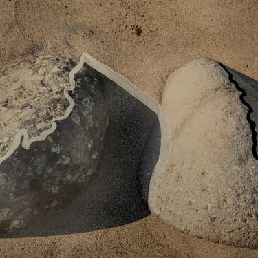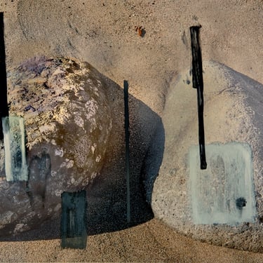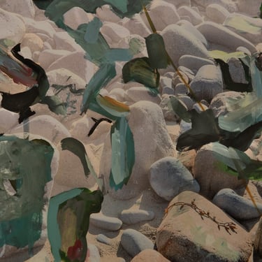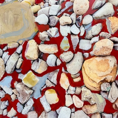 This series is based on rocks and the idea that rocks are solid, trustworthy and that boulders stay put. But these beach rocks have been tossed and tumbled, worn down and embedded in the sand and sea. The colors that shimmer so vividly in the water disappear when dry. Walking through a rocky terrain takes attention and caution. So these rocks become metaphors for the uncertainty of things we once thought grounded.