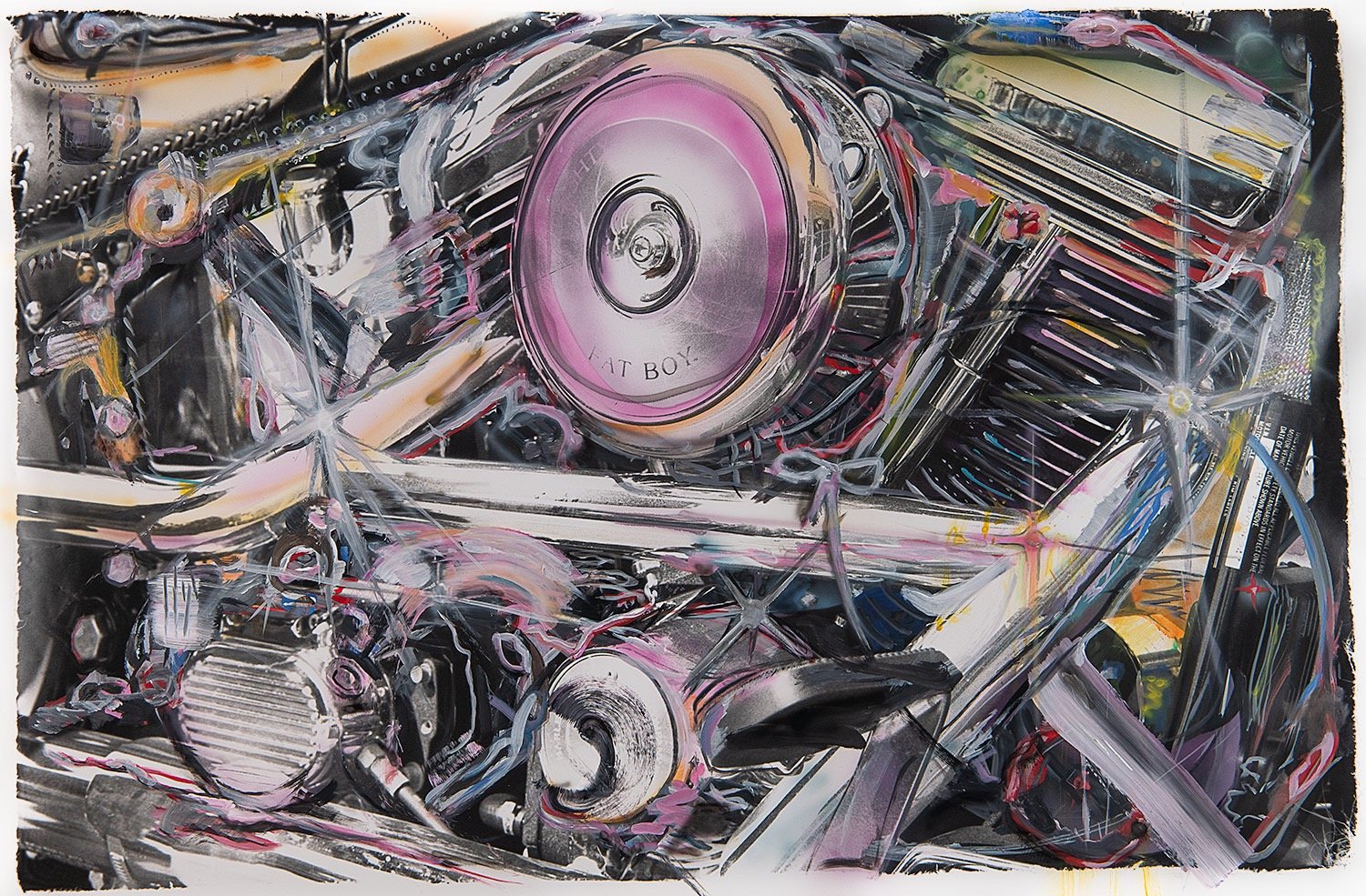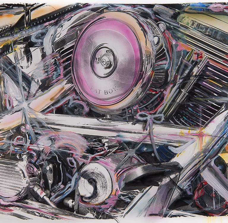I've photographed motorcycles and motorcycle culture for many years and I've published two books Chicks on Bikes and Live Full Throttle . My motorcycle work has been featured in countless publications and art shows. I was gifted this large scale print by a friend and it was a great joy to bring my brush to bear. Beyond a graphic document of this shining Fat Boy Harley Davidson, layering on paint is my abiliy to bring my intimate experience and memory.